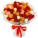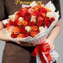Моно букет из 51 розы в изящной флористической упаковке. Требует ежедневной замены воды в вазе и подрезки стебля на 1-2 см. Розы любят много воды не менее 2/3 высоты от букета.