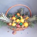 Ананас, манго, апельсины, киви, груша, нобилис, корзина, шар новогодний, шишки, пленка, лента.