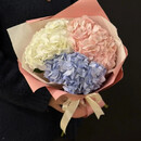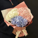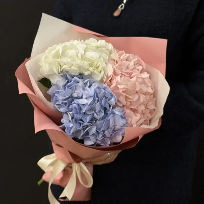 Букет из трех гортензий — это стильный, объемный и лаконичный монобукет. Благодаря пышности, нежности оттенков и символике искренности такой букет выглядит модно, благородно и идеально подходит для любого повода.