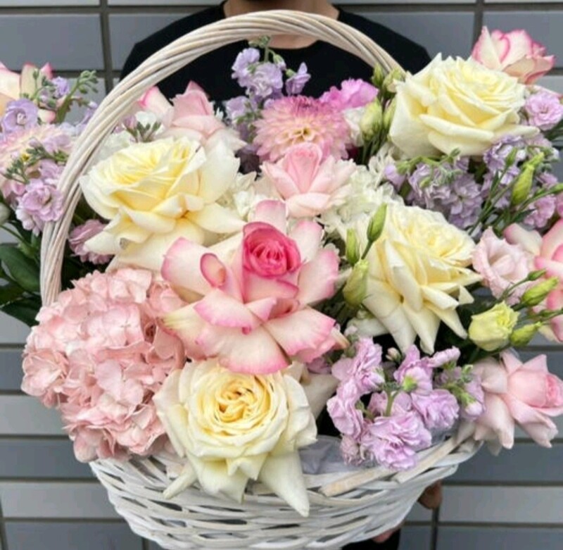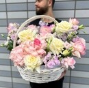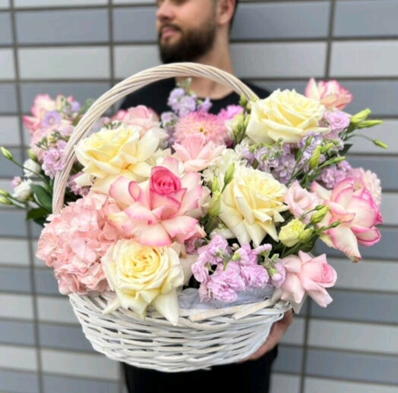 Большая корзина с французскими розами , гортензиями , эустомой и диантусами