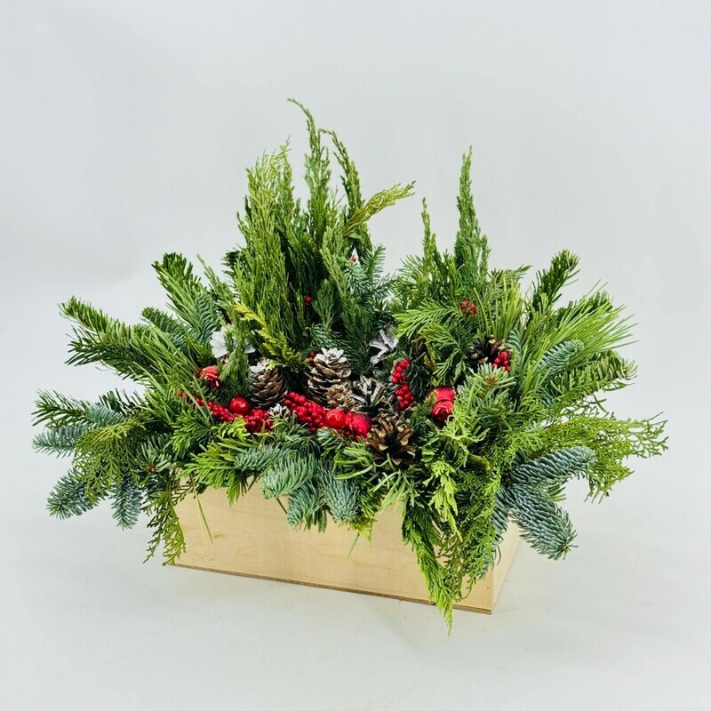 Погрузитесь в атмосферу зимней сказки с элегантным букетом из натуральной хвои нобилис, датской ели и лапника. Эта восхитительная новогодняя композиция, выполненная в уютном деревянном ящике, станет идеальным украшением для вашего интерьера и подарком для самых близких.