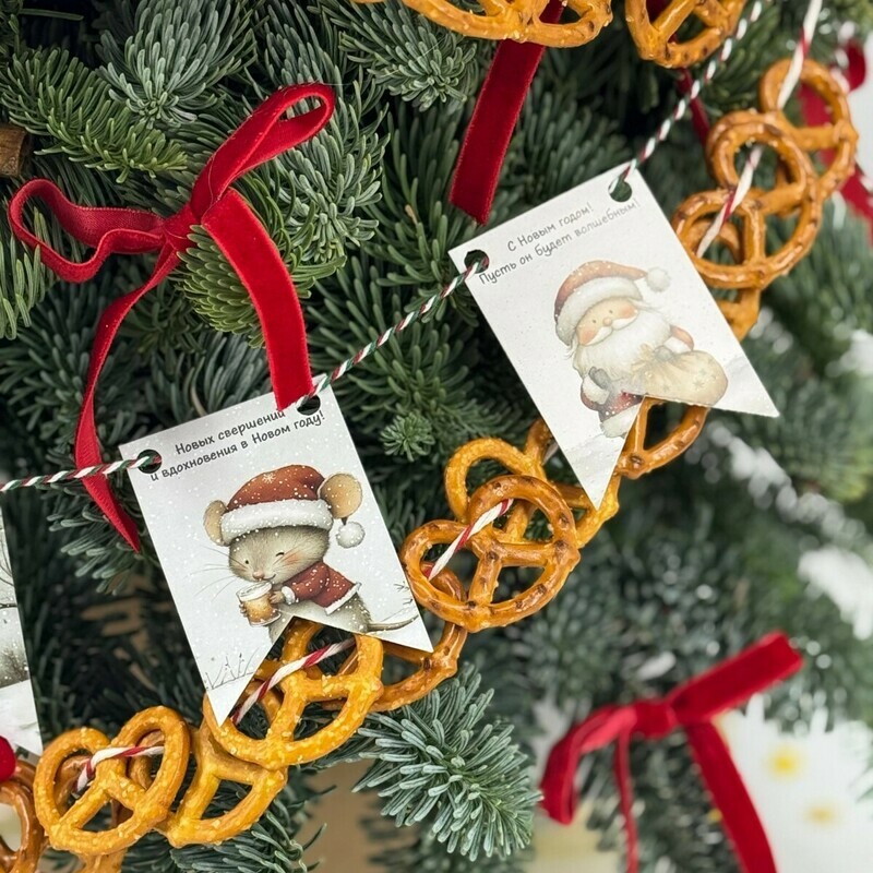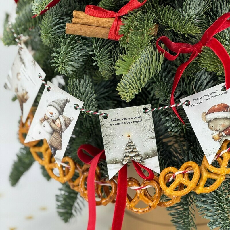 Новогодняя ёлочка 70 см ручной работы из нобилиса с гирляндами флажки и крендельки в шляпной коробке, стандартный