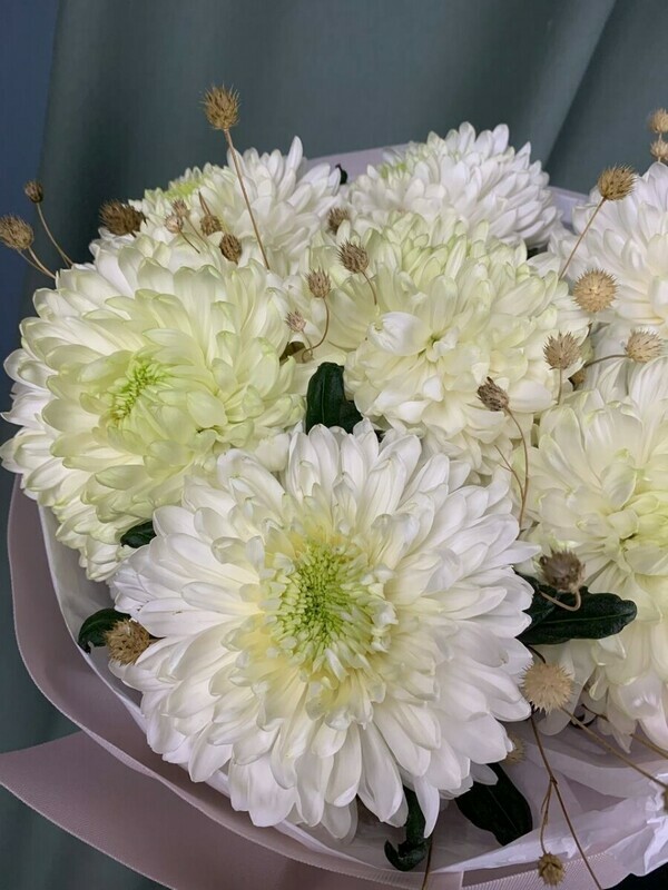 Идеальный букет на все случаи жизни! Элегантная круглая композиция из белых одноголовых хризантем и натуральных сухоцветов в упаковке из крафтовой бумаги. Этот невероятно стойкий букет будет радовать своей красотой неделями — он прекрасно подходит для любого времени года. Станет трогательным подарком маме на День Матери или искренним знаком внимания без повода. Лаконичная белая гамма и природная текстура сухоцветов создают универсальный стиль, который подчеркнет ваши чувства. Закажите доставку свежих цветов по Ростову-на-Дону — гарантируем аккуратную доставку вашего долговечного подарка.