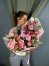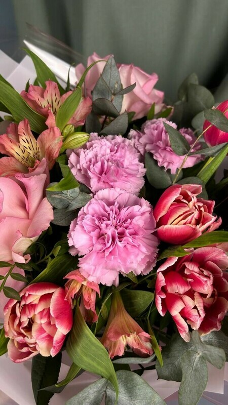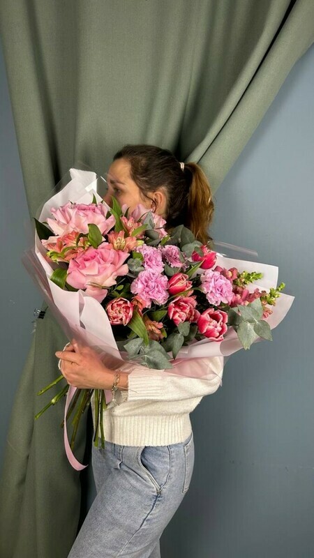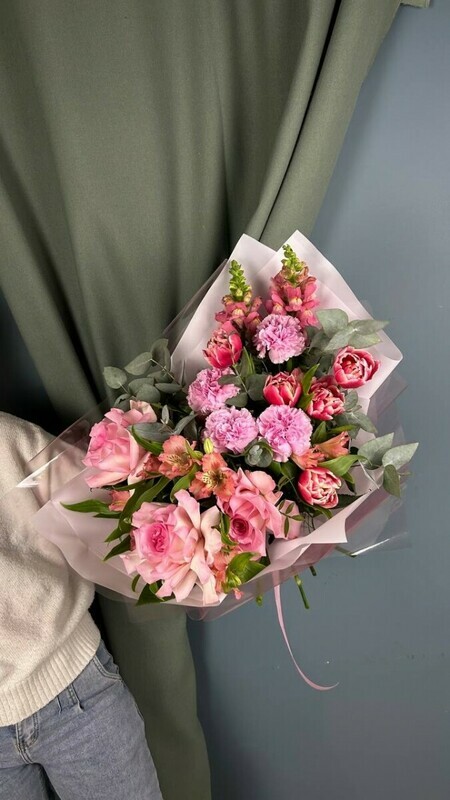 Купите раскидистый букет в розовых оттенках с розами Эквадор в Ростове-на-Дону. Роскошные кружевные одноголовые розы, диантусы, альстромерия, тюльпаны и антиринум в обрамлении эвкалипта создают объемную романтическую композицию. Универсальный выбор на свадьбу, юбилей, для мамы или любимой. Букет выглядит дорого и нежно. Гарантируем свежесть цветов и своевременную доставку в любую точку города.