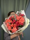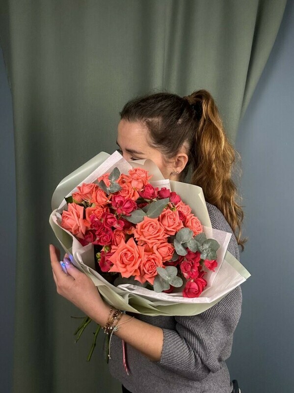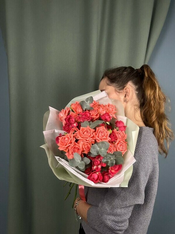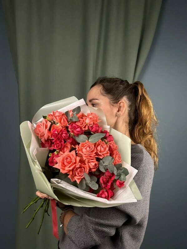 Яркий и запоминающийся букет из кустовых роз двух оттенков: благородного алого и нежного кораллового. Пышные бутоны обрамляет свежая зелень эвкалипта, которая подчеркивает насыщенность цвета и дарит композиции легкий, терпкий аромат. Этот букет — идеальный способ признаться в чувствах без слов. Прекрасный подарок для любимой девушки, жены или коллеги на юбилей, свидание или 8 Марта. Сочетание красного и кораллового символизирует энергию, любовь и искреннюю радость.