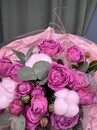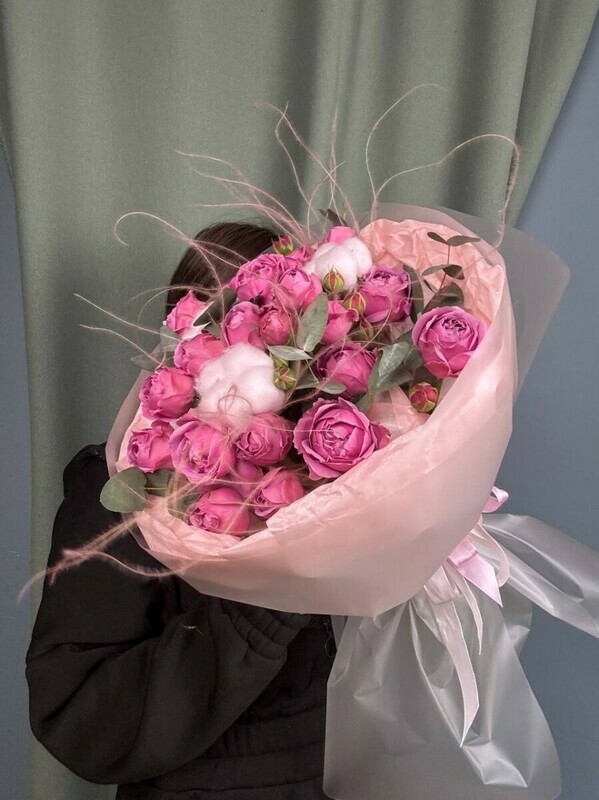 Этот букет похож на сон в розовых тонах — воздушный, невесомый и бесконечно нежный. В центре внимания — пионовидная роза Мисти Бабллз с ее крупными, "пушистыми" бутонами самого нежного сиренево-розового оттенка, напоминающими облака на рассвете . Их поддерживают пушистые коробочки розового хлопка, символизирующие домашний уют и тепло, добавляя композиции трогательную простоту и естественность .