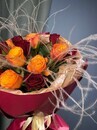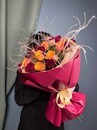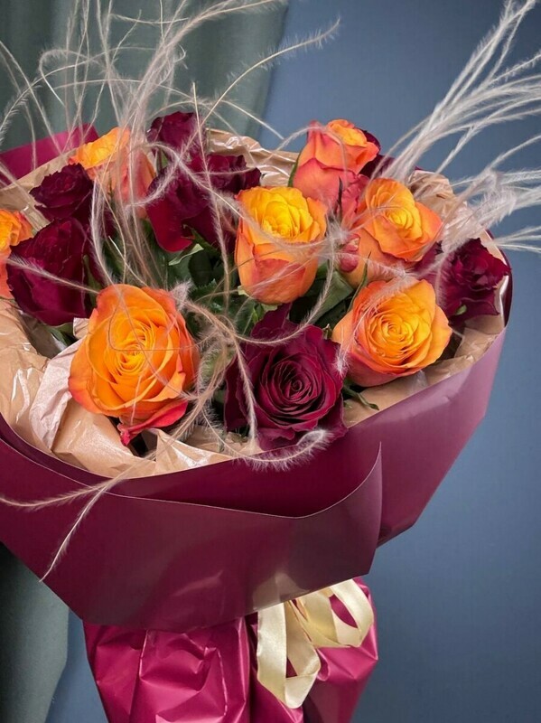 Изысканная игра контрастов: насыщенный красный, энергичный оранжевый и воздушный белый. Бархатистые бутоны кенийских роз обрамлены графичными перьями ковыля, который создает эффект движения и невесомости. Яркая красная упаковка становится холстом для этой живой картины. Букет, который хочется рассматривать как произведение современного искусства.