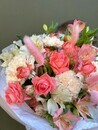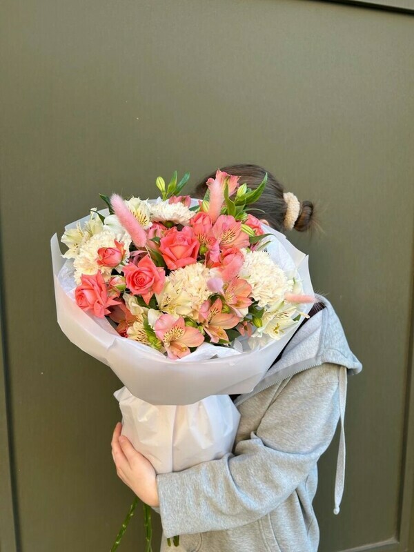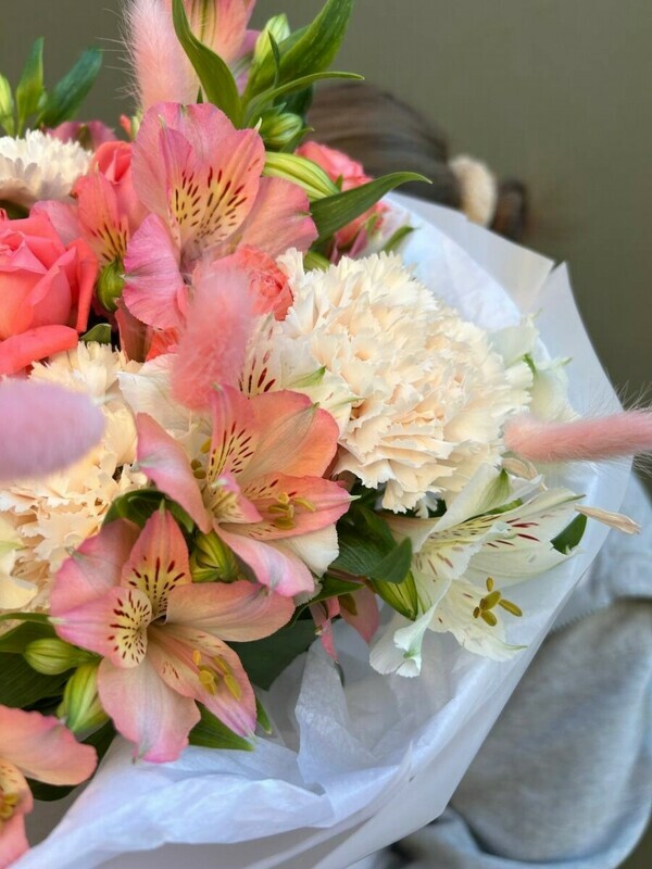 Стильная композиция в тёплой гамме. Сочетание бархатистой розы «Барбадос», нежных диантусов, яркой альстромерии и фактурного лагуруса создаёт современный, объёмный и жизнерадостный букет. Идеален для подарка энергичным, творческим людям, ценителям нестандартной флористики.