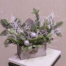 Новогодняя композиция в деревянном ящике: ветви ели «Нобилис», серебристые шары, шишки и веточки-«иней». Создаёт зимнюю атмосферу — стильно и празднично! Этот букет прекрасно дополнит подарок на зимний день рождения, Новый год, Рождество и другие поводы в зимние месяцы. По запросу добавим в заказ сладости, игрушки, воздушные шары или вазу.