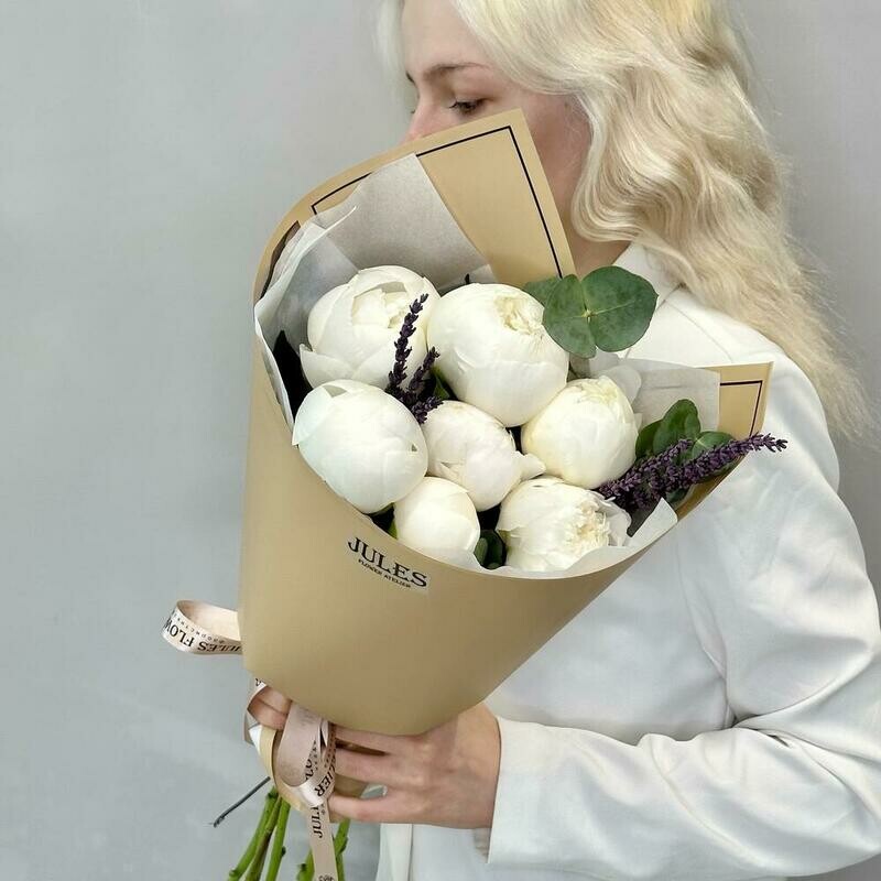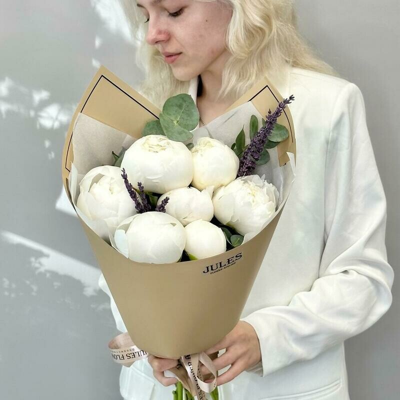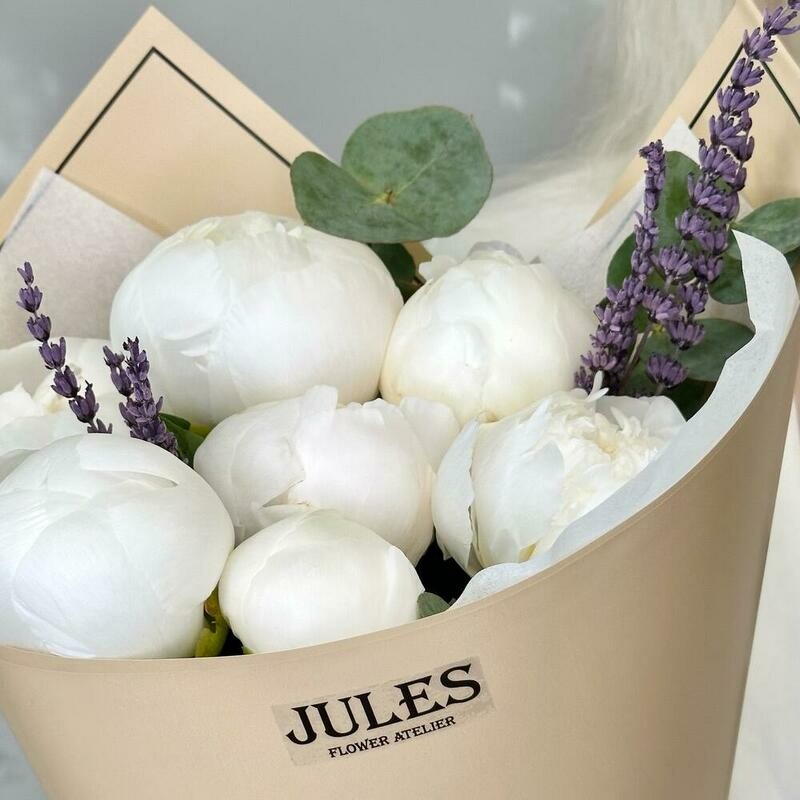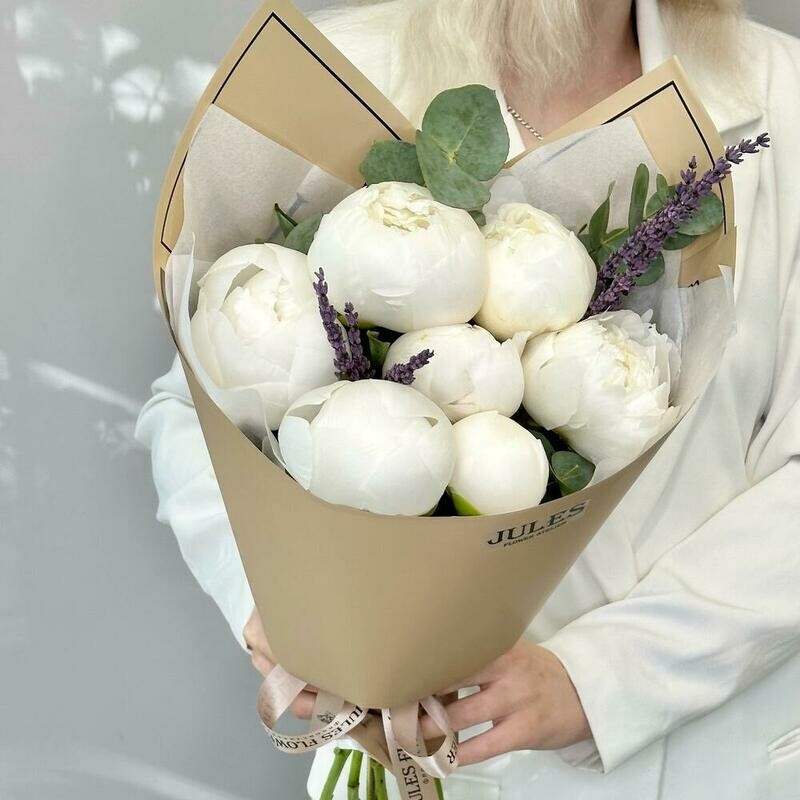 - «Сон Жуля»букет из пионов 7 шт эвкалипта и лаванды стабилизированной