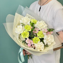 - «Спринг» нежный букет из белых франзуских роз, гвоздик и альстромерии