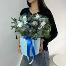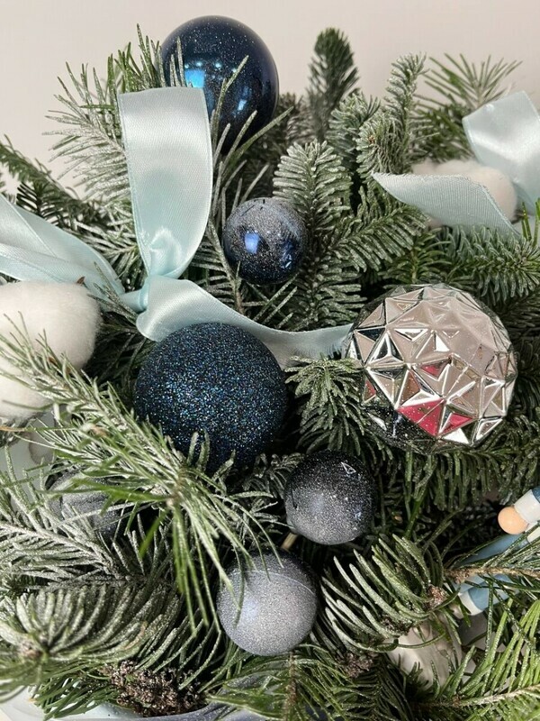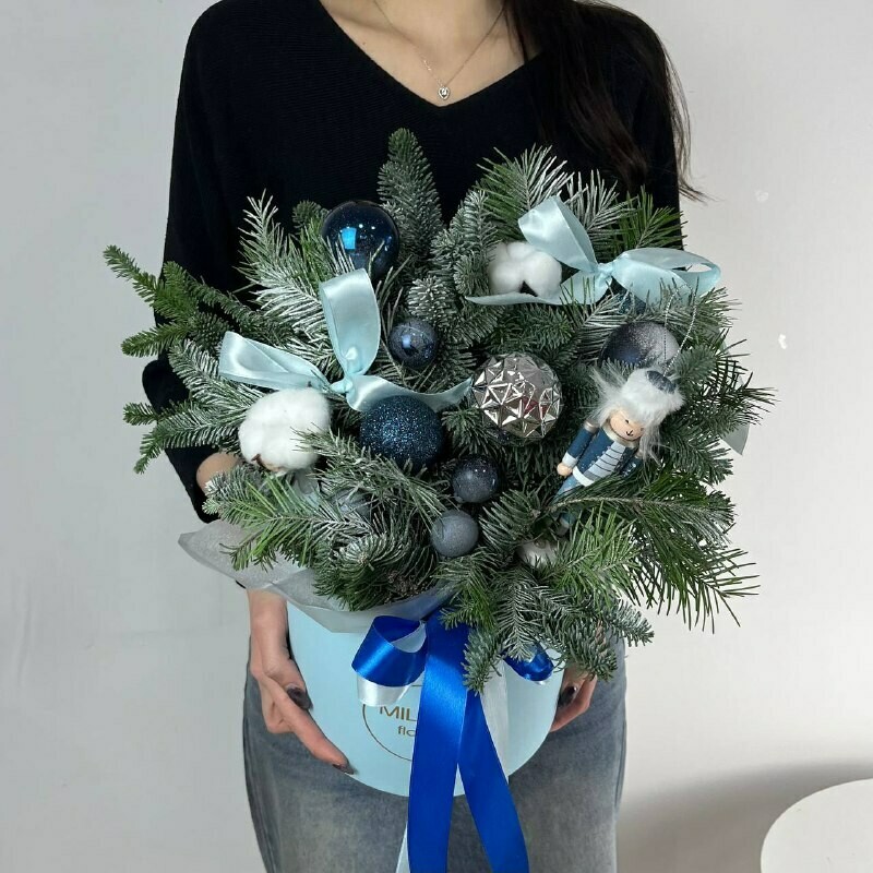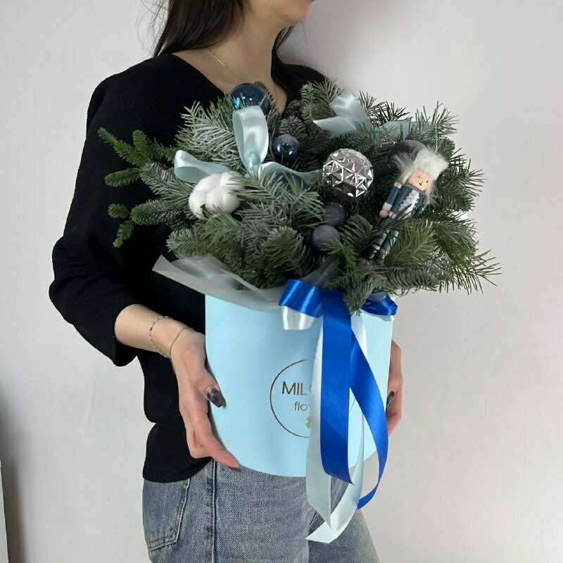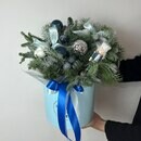 - Бокс новогодний из нобилиса, пихты, хлопка и елочных игрушек