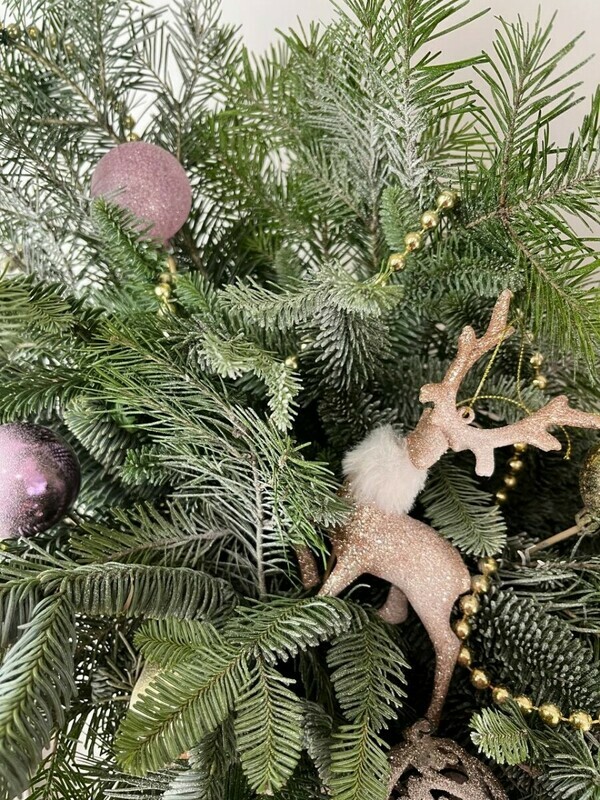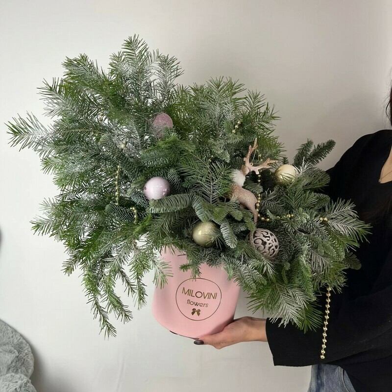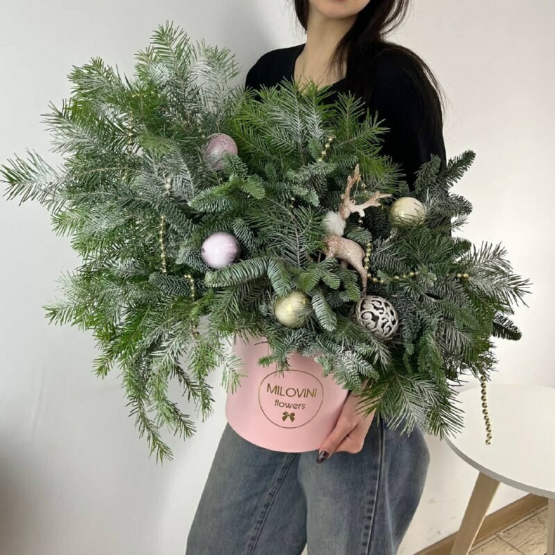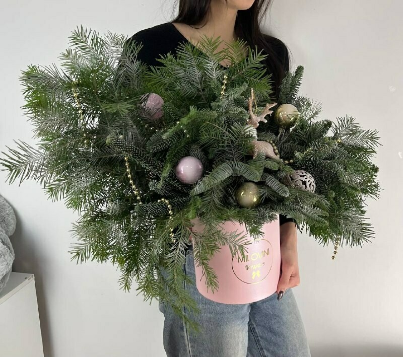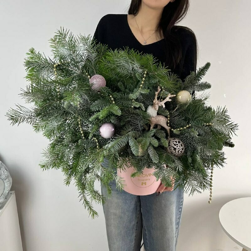 - Бокс новогодний из нобилиса, пихты и елочных игрушек