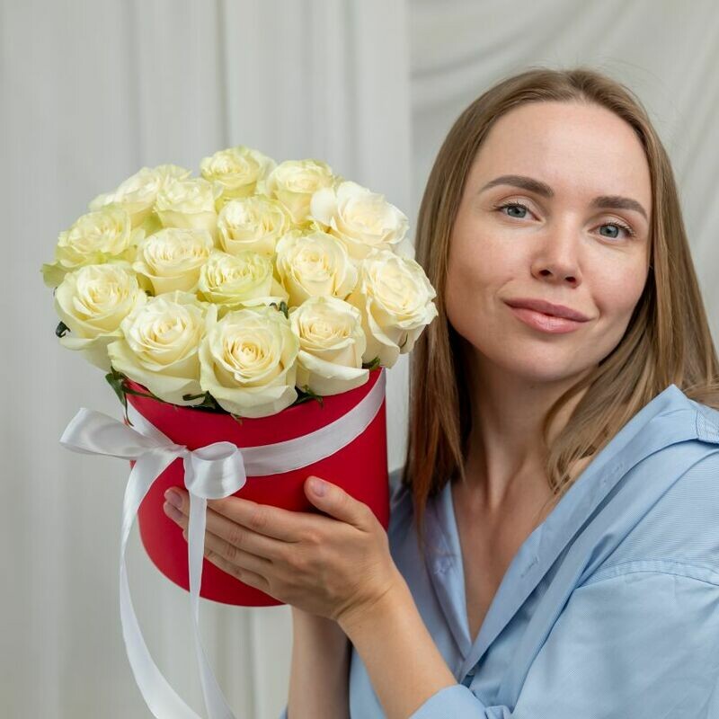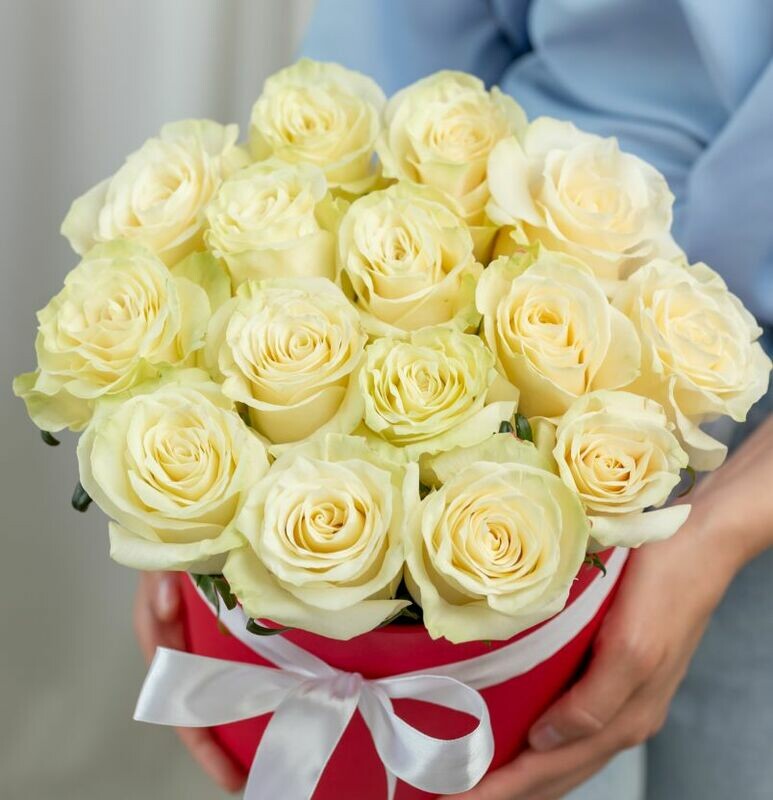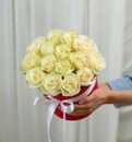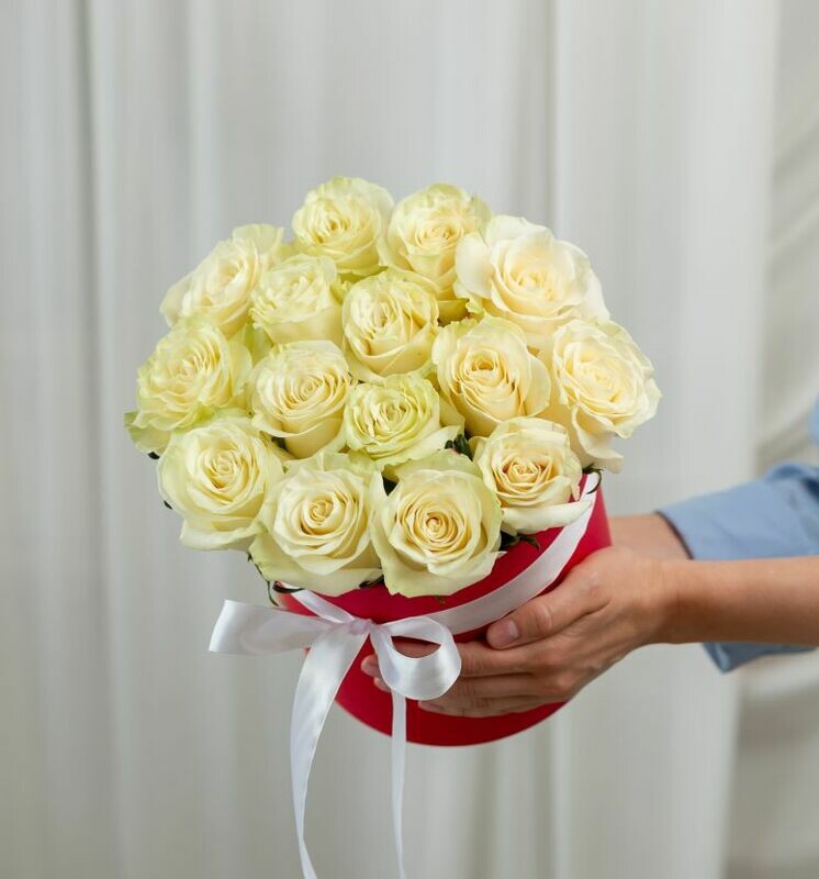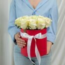 В составе 15 белых роз ,шляпная коробка, флористическая губка.