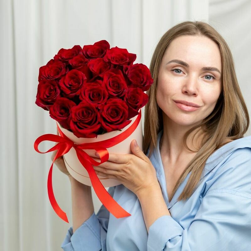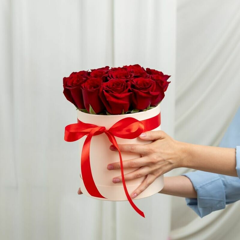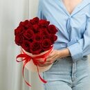 В составе 15 красных роз (сорт Эквадор), шляпная коробка, флористическая губка.