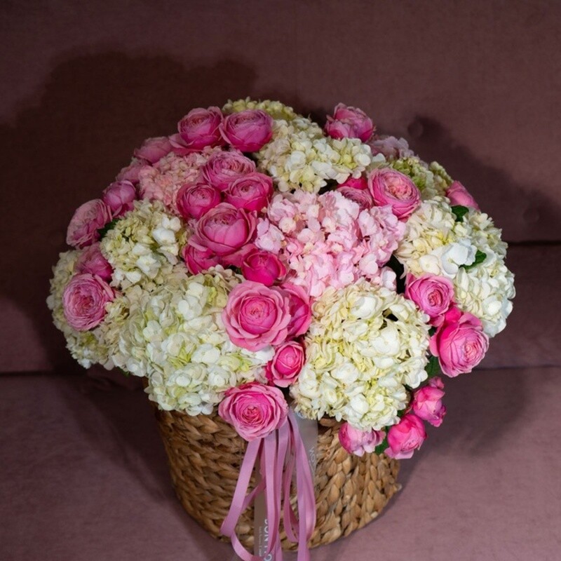 Корзина с гортензиями и розами "Ароматные признания" — это изысканная цветочная композиция, созданная для тех моментов, когда хочется выразить чувства особенно мягко и красиво. Нежные гортензии придают корзине воздушность, чистоту и свет, а розовые розы наполняют её теплом, нежностью и лёгкой романтичностью. Такое сочетание смотрится гармонично и элегантно, а сама корзина становится выразительным акцентом любого пространства — от уютного дома до торжественного мероприятия.