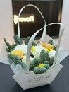 Небольшая композиция из живых цветов и елового лапника в удобной к транспортировке сумочке