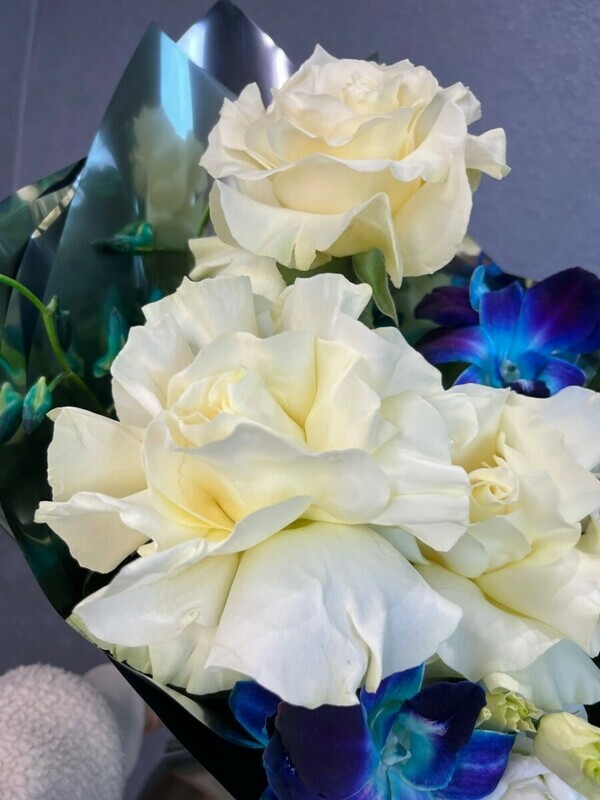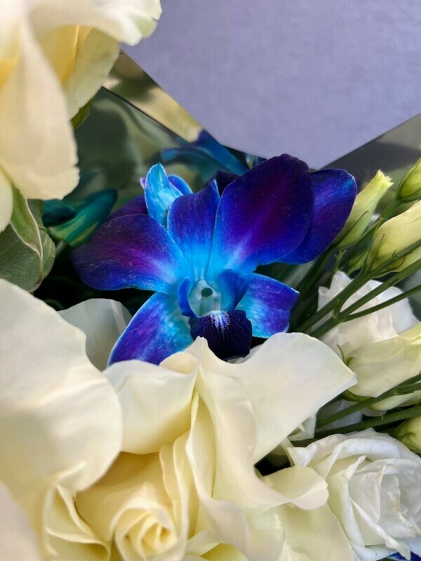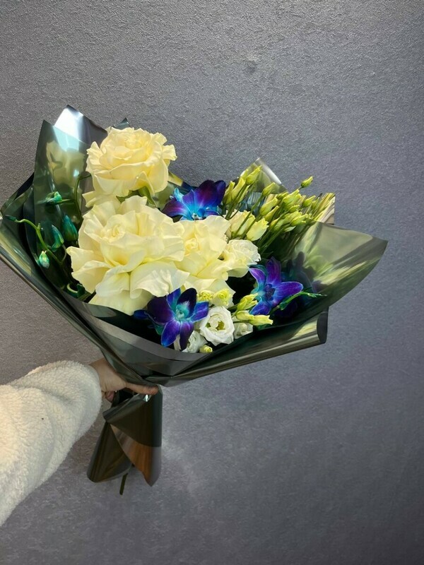 Роза французская- 3шт Эустома -2шт Дендробиум- 3шт Упаковка-1шт