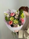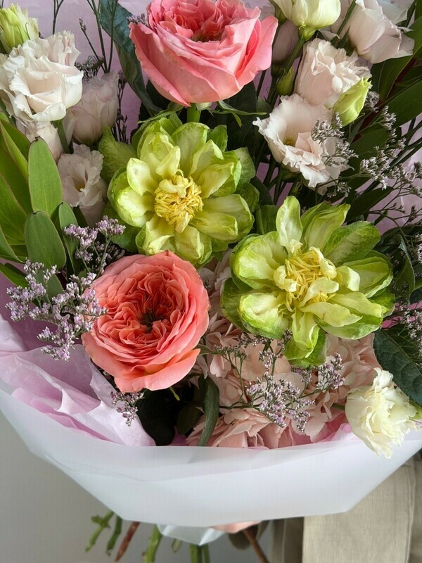 Букет розово-зеленый роза вегги – это стильный и яркий подарок, который подойдет для любого повода. В составе букета представлены разнообразные цветы, такие как роза французская, эустома, статица, гвоздика, озотамнус, роза пионовидная и другие.