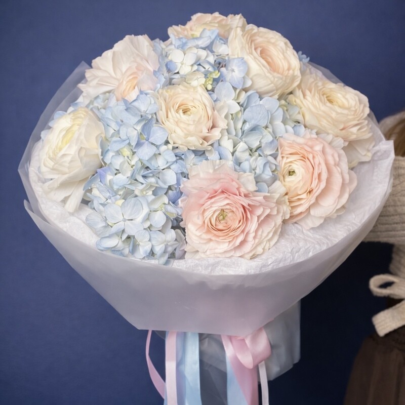 Премиальный букет с гортензией и ранункулюсами (лютики)