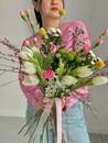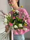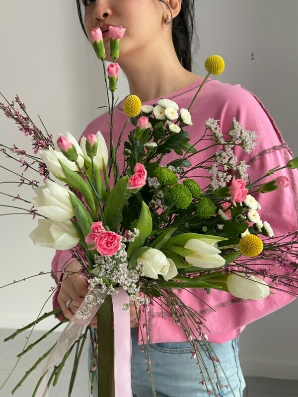 Букет "SPRING IS COMING" - тюльпаны, гениста, гвоздика, хризантема и лимониум