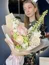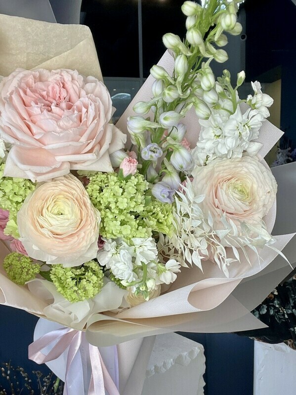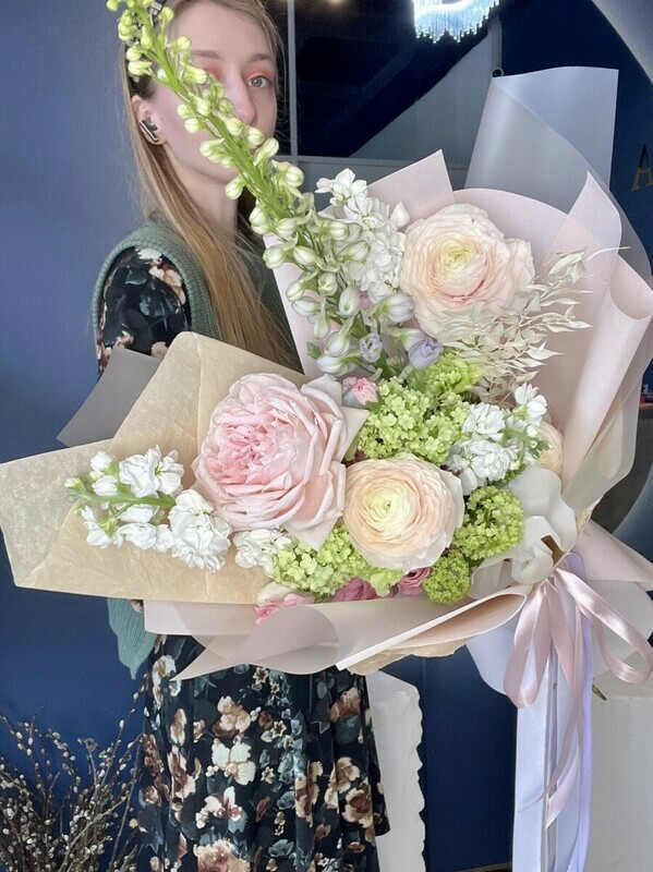 - «Душистая симфония» : ранункулюс , пионовидная роза , вибурнум , дельфиниум