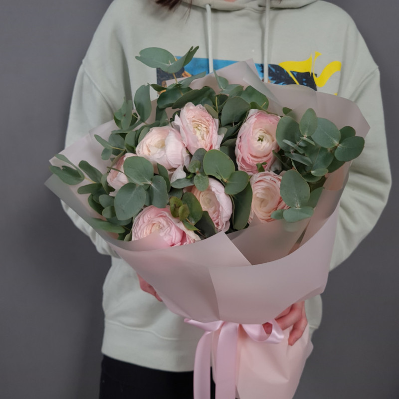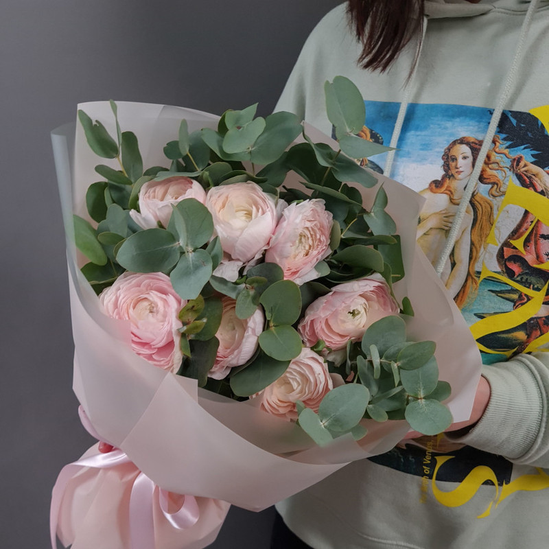 - Нежные ранункулюсы с эвкалиптом