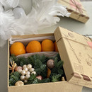 Картонная коробка с живой елью, новогодним декором и мандаринами