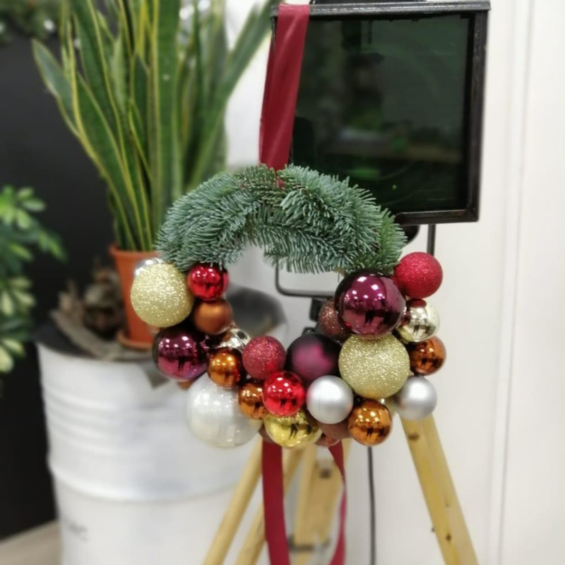 Новогодний предмет интерьера из живой датской ели. Украсьте входную группу таким интересным декором. Возможно изготовление в разных цветовых гаммах и стилистике (уточняйте при заказе)