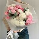 Букет из 5 белых и розовых хризантем с эвкалиптом
