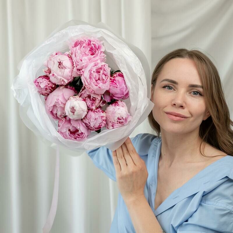 Букет из 9 розовых пионов Сара Бернар в фирменной упаковке.