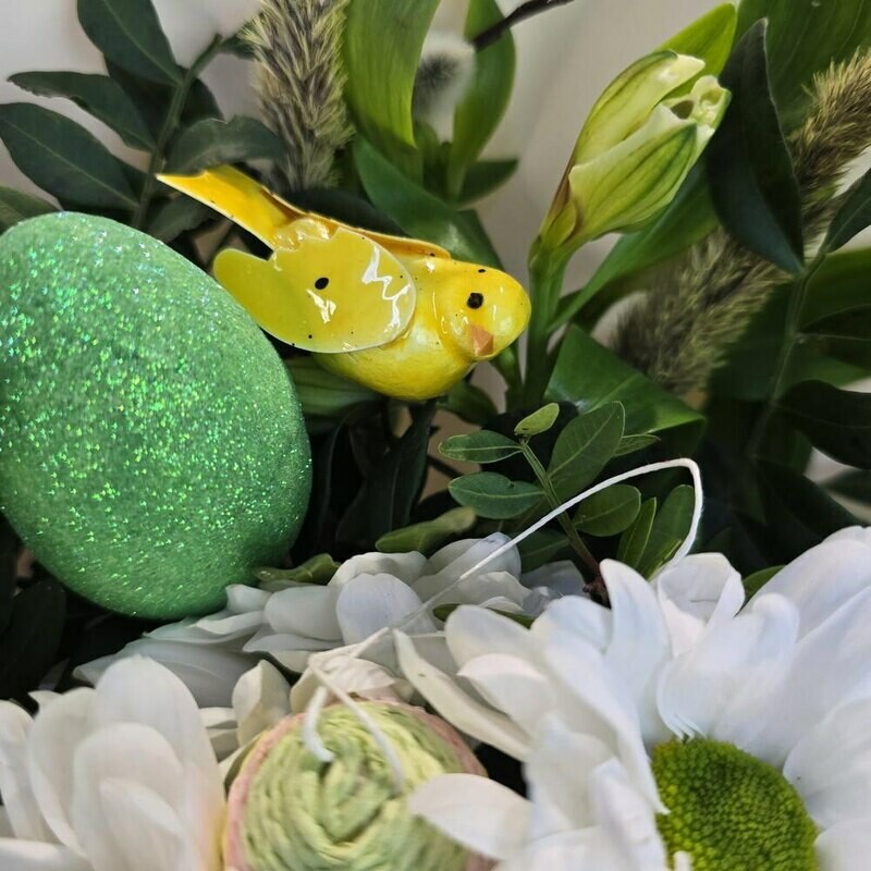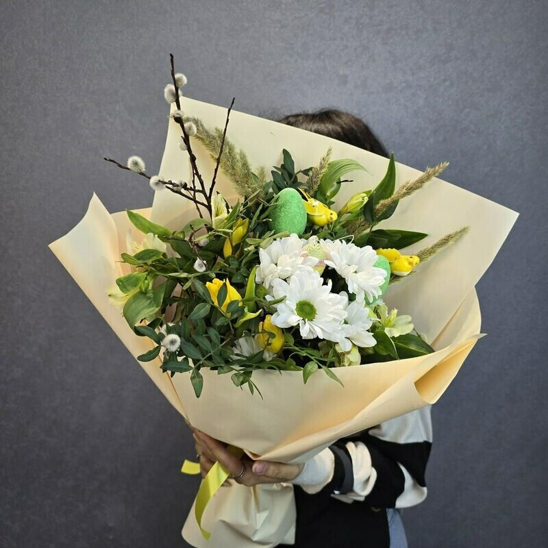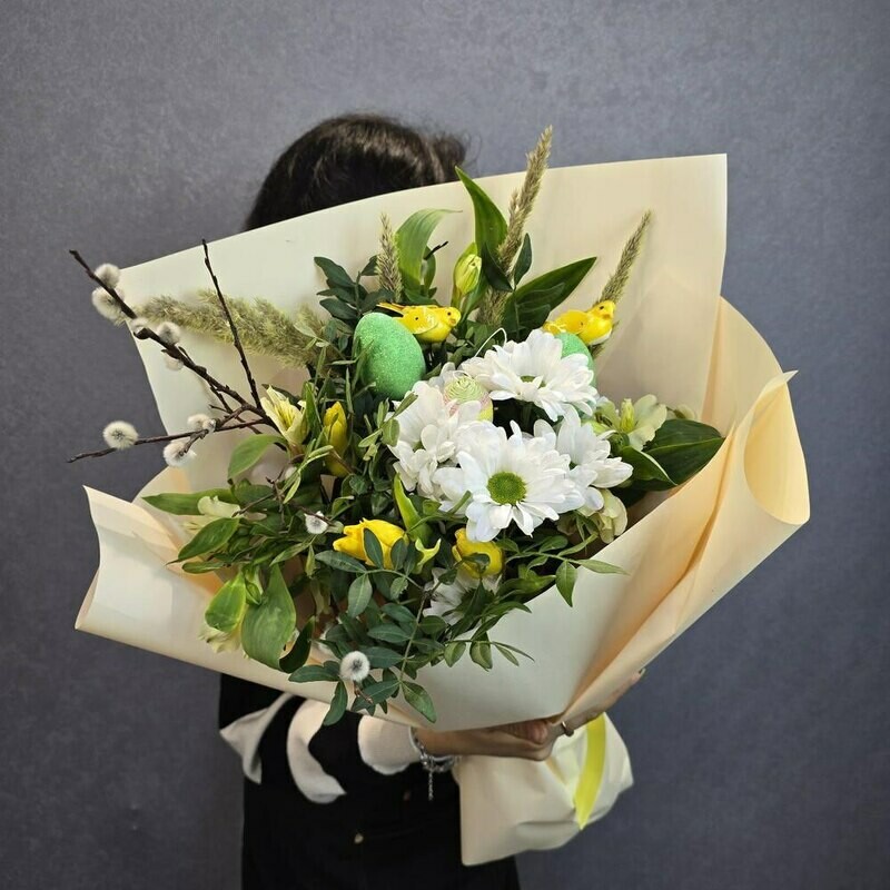 Позвольте представить эту удивительную композицию — символ весны и обновления! Сочетание свежих цветов, природных элементов и милых декоративных деталей создаёт атмосферу уюта и радости. Этот букет станет прекрасным подарком для любимого человека, наполнит дом светом и принесёт весеннее настроение.
