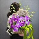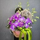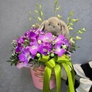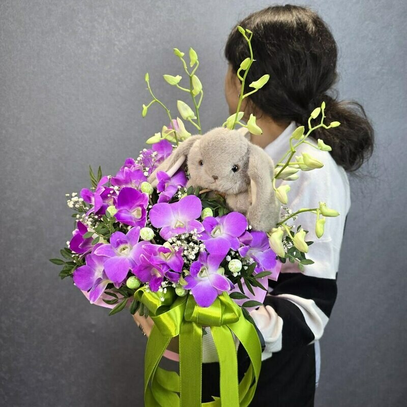 Этот очаровательный букет словно воплощает собой весеннее настроение и детскую радость! Яркие фиолетовые орхидеи, нежные веточки гипсофилы и свежая зелень собраны в стильной розовой коробке, украшенной сочной зелёной лентой. Особую изюминку композиции придаёт милый плюшевый кролик — он будто прячется среди цветов, вызывая улыбку и умиление. Такой букет принесёт радость как ребёнку, так и взрослому, напоминая о тёплых моментах и заботе.