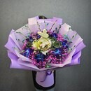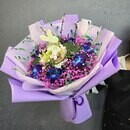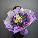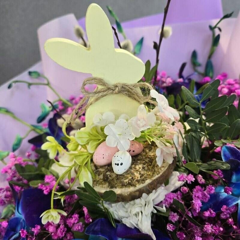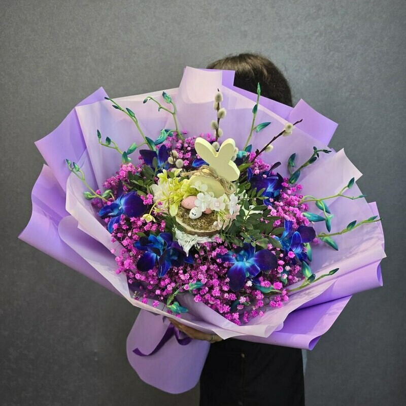 Этот букет — словно всплеск весенней фантазии, воплощённый в цветах. Нежные оттенки фиолетового и розового переплетаются с глубокими синими акцентами орхидей, создавая гармонию контрастов. Центральную ноту композиции задаёт очаровательный декор в виде зайчика, окружённого пушистыми веточками и нежными соцветиями. Фиолетовая упаковка придаёт букету завершённость, окутывая его лёгкой таинственностью. Это не просто цветы — это маленькое произведение искусства, способное подарить улыбку и поднять настроение.