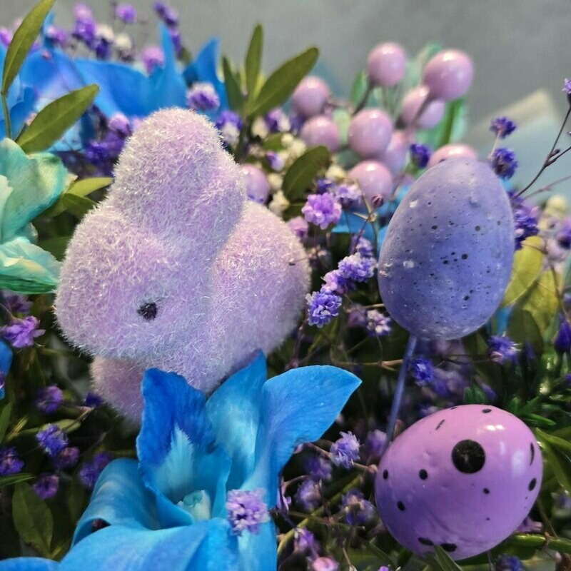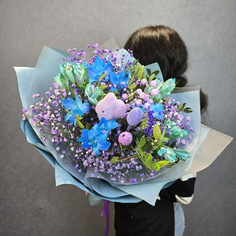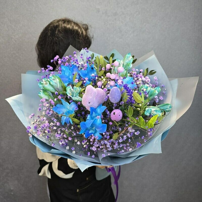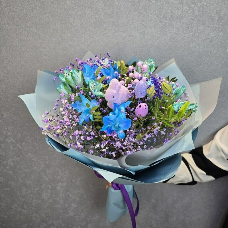 Этот букет — словно весенняя сказка, воплощённая в цветах. Яркие синие орхидеи напоминают лазурные крылья бабочек, порхающих среди нежных соцветий гипсофилы. Пушистый зайчик и пастельные пасхальные яйца добавляют композиции игривости и уюта. Лёгкая голубая упаковка окутывает букет, словно утренний туман, придавая ему воздушность и очарование.