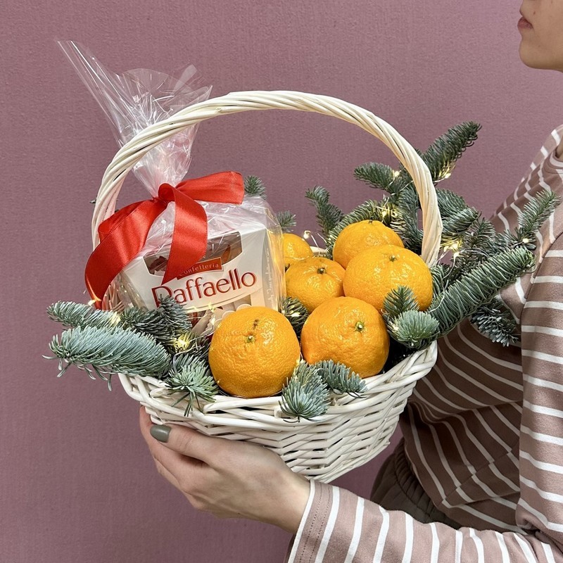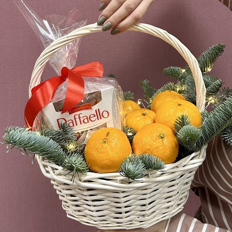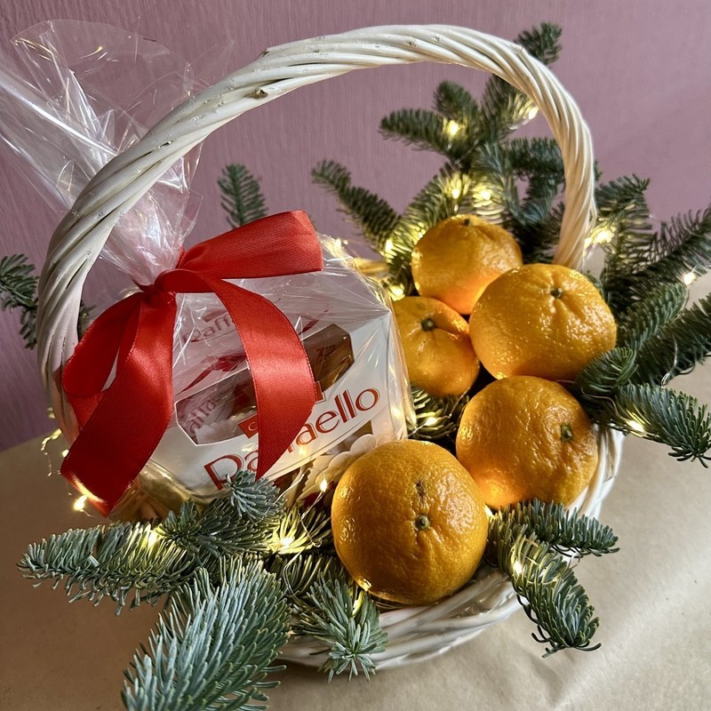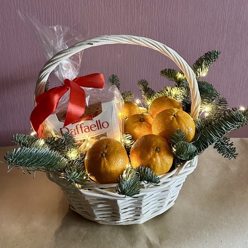 - Светящаяся корзина с ёлкой (нобилис), конфетами и мандаринами