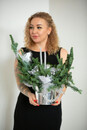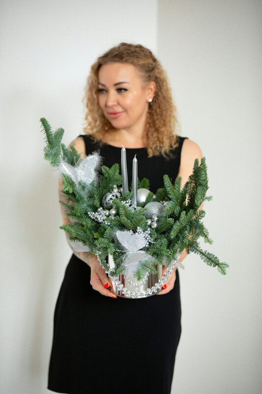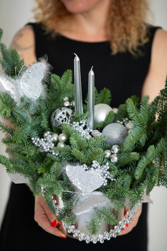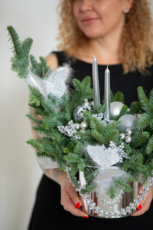 Нобилис и ёлочные украшения, стеклянные бусы, серебристые бабочки в металлическом цилиндре