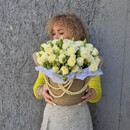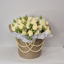 Белые кустовые розы с кремовым подтоном в джутовой корзине, украшенной жемчужными нитями