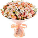 Нежный букет в пастельных тонах создан для самых романтичных и трогательных дам. Необычная лососевая гвоздика, бархатная розовая роза, воздушный белый лизиантус, полупрозрачная кремовая хризантема и лепестки эвкалипта очень гармонично соединились в ансамбле трепетности, нежности и красоты.