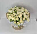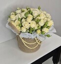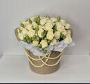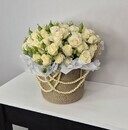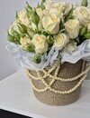 Белые цветы с легким молочным отливом и махровой структурой в джутовой корзине ручной работы с жемчужными нитями