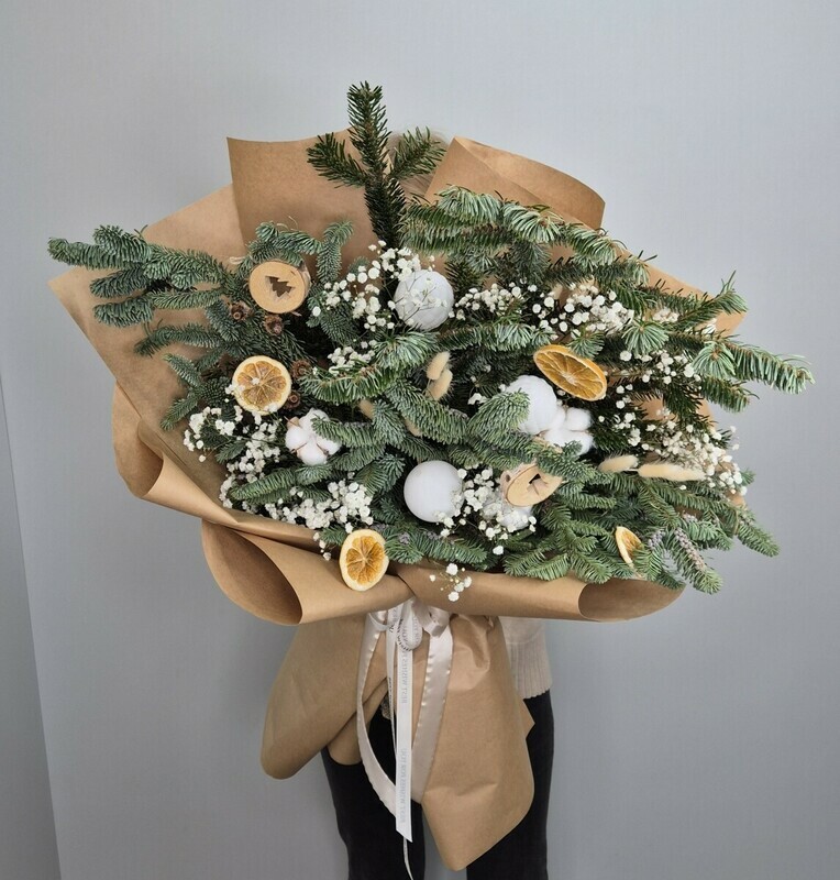 Волшебный букет с веточками нобилиса и снежинками гипсофилы дополненный новогодним декором