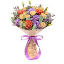 Поистине роскошная и пышная цветочная композиция в стиле барокко сочетает в себе чувственность и грациозность за счет хрупких синих лизиантусов, кремовых кустовых розочек, синего лимониума и оранжевых гвоздик. Динамичное настроение букета делает его отличным подарком как стильной и уверенной в себе женщине, так и романтичной и хрупкой девушке.