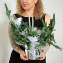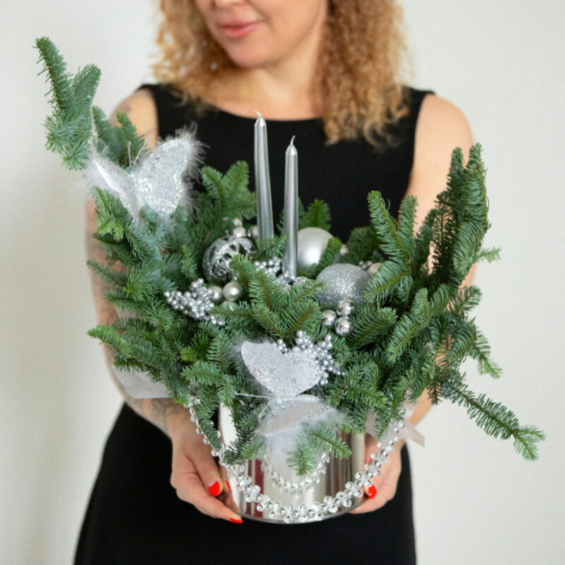 Нобилис и ёлочные украшения, стеклянные бусы, серебристые бабочки в металлическом цилиндре