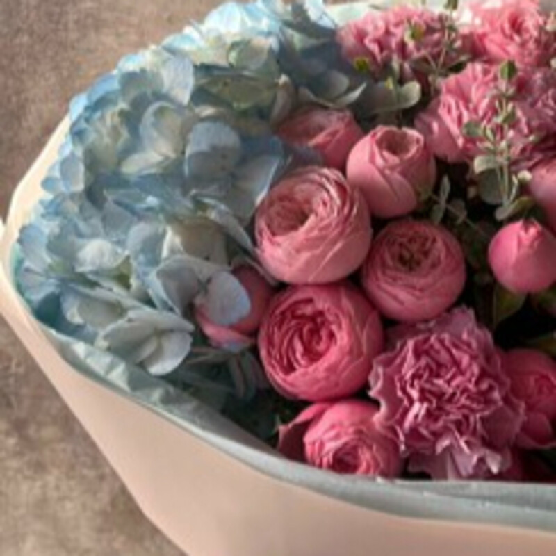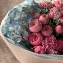 - Букет микс с гортензией, кустовыми розами и диантусами