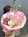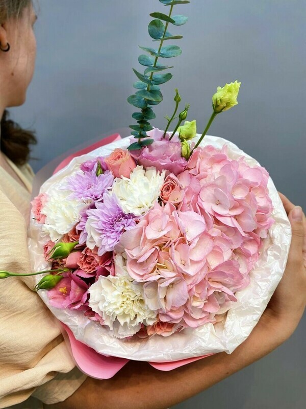 Яркий микс букет с добавлением пионовидной розы и гортензии