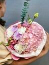 - Яркий микс букет с добавлением пионовидной розы и гортензии