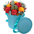 Головокружительно яркая и безупречно оригинальная композиция из коралловых и рыжих роз, красных ягод гиперикума, голубых краспедий, брунии и эвкалипта – это квинтэссенция стиля и образец безупречного вкуса. Цветы оформлены в аккуратную дизайнерскую коробку, как долгожданный подарок. Такой очаровательный сувенир таит в себе волнительное предвкушение сюрприза.