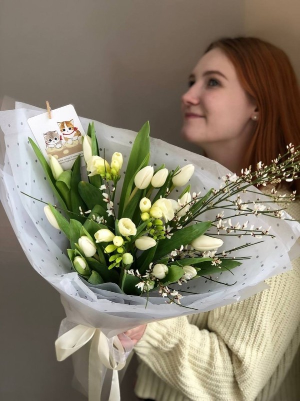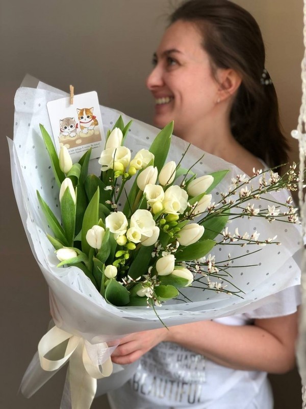 - Ароматный букет весенних цветов из тюльпанов, фрезии и генисты