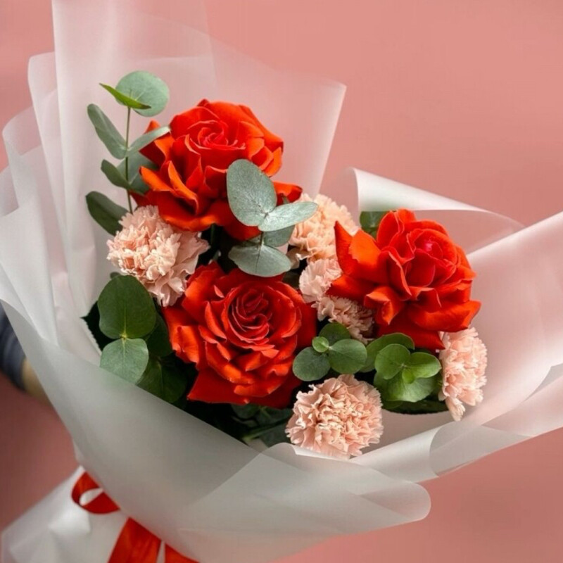 Страсть авторский букет — это изысканная композиция из розы и гвоздики, дополненная эвкалиптом. Элегантная упаковка подчёркивает красоту цветов. Букет подойдёт для выражения чувств и станет прекрасным подарком для близких на любой праздник
