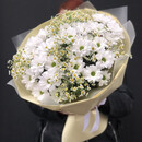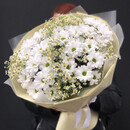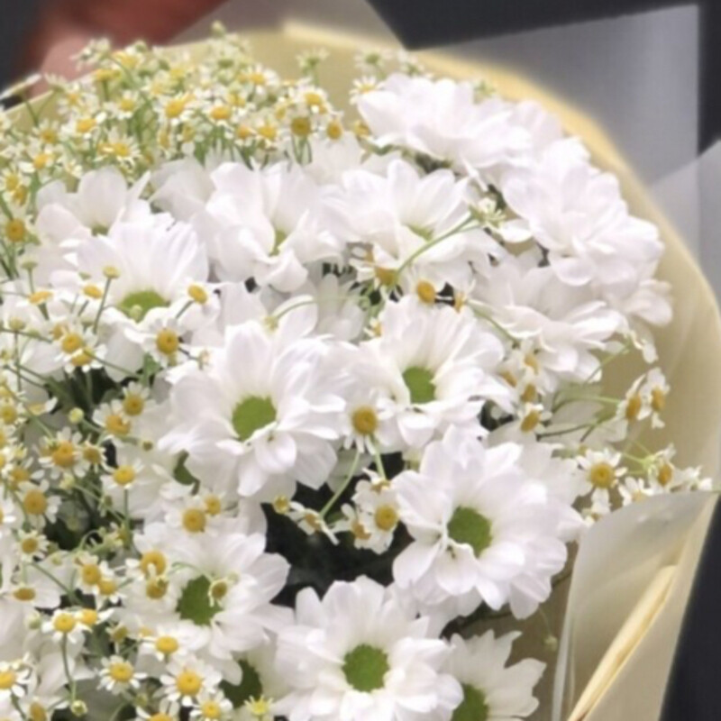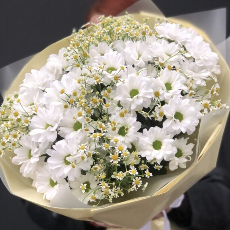 Букет «Хризантема и ромашки Камилла» — это гармоничное сочетание кустовой хризантемы и ромашек Камилла. Элегантная композиция в атласной ленте подойдёт для выражения чувств и станет прекрасным подарком для близких. Идеален для любых случаев.